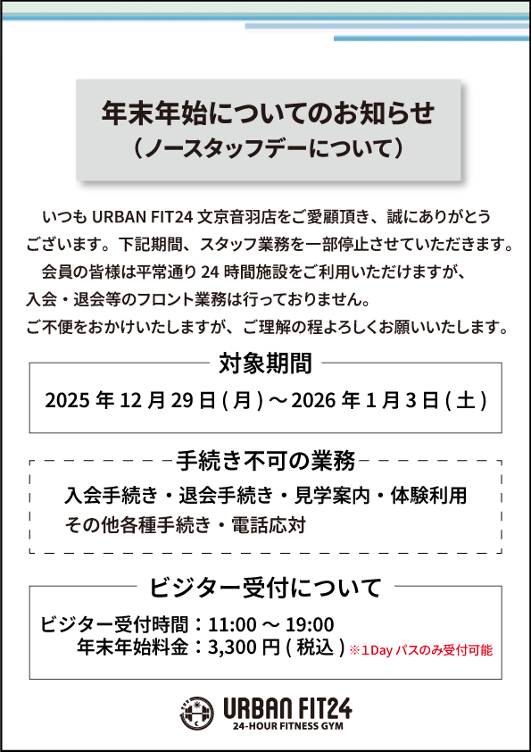 【文京音羽店】年末年始ノースタッフデーのお知らせ