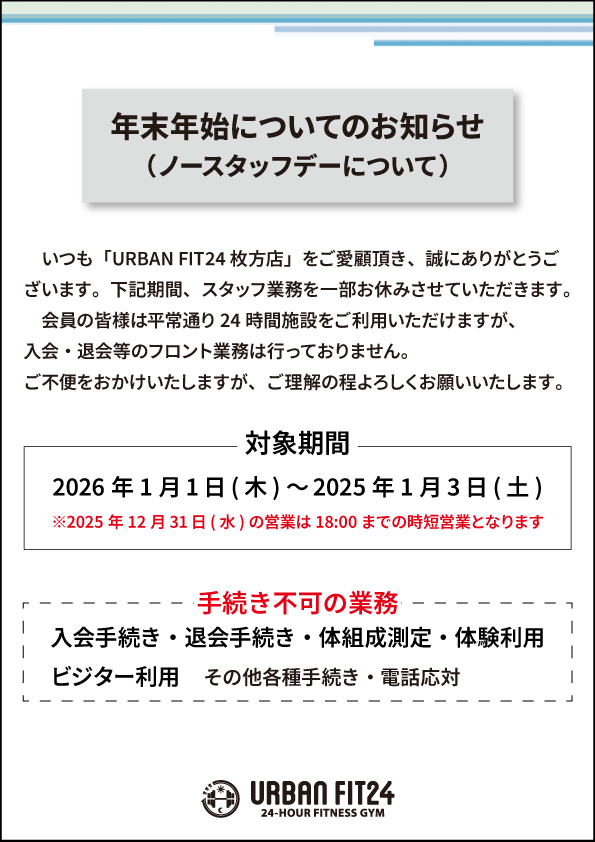 【枚方店】年末年始ノースタッフデーのお知らせ