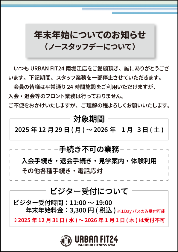 【南堀江店】年末年始ノースタッフデーのお知らせ